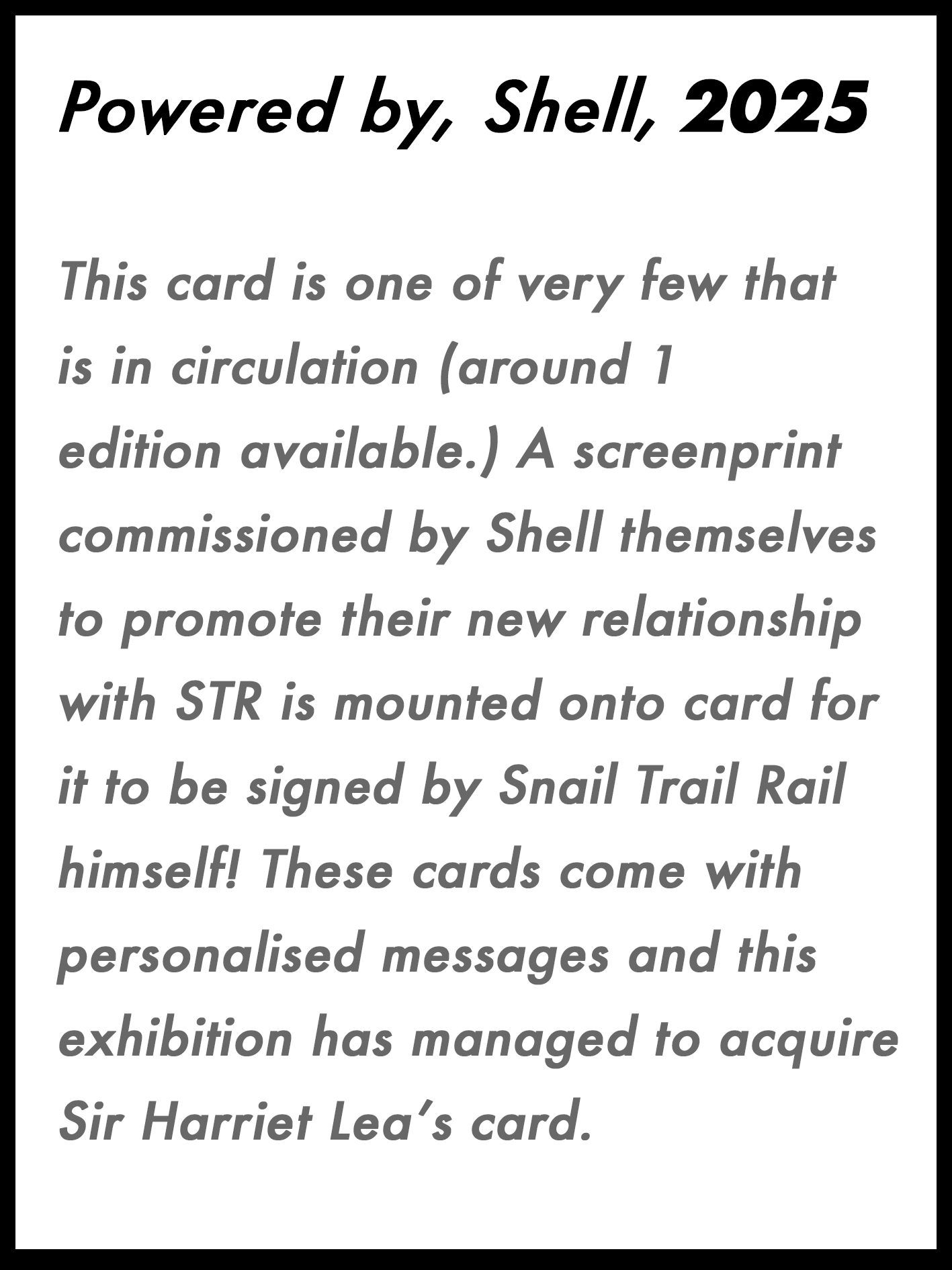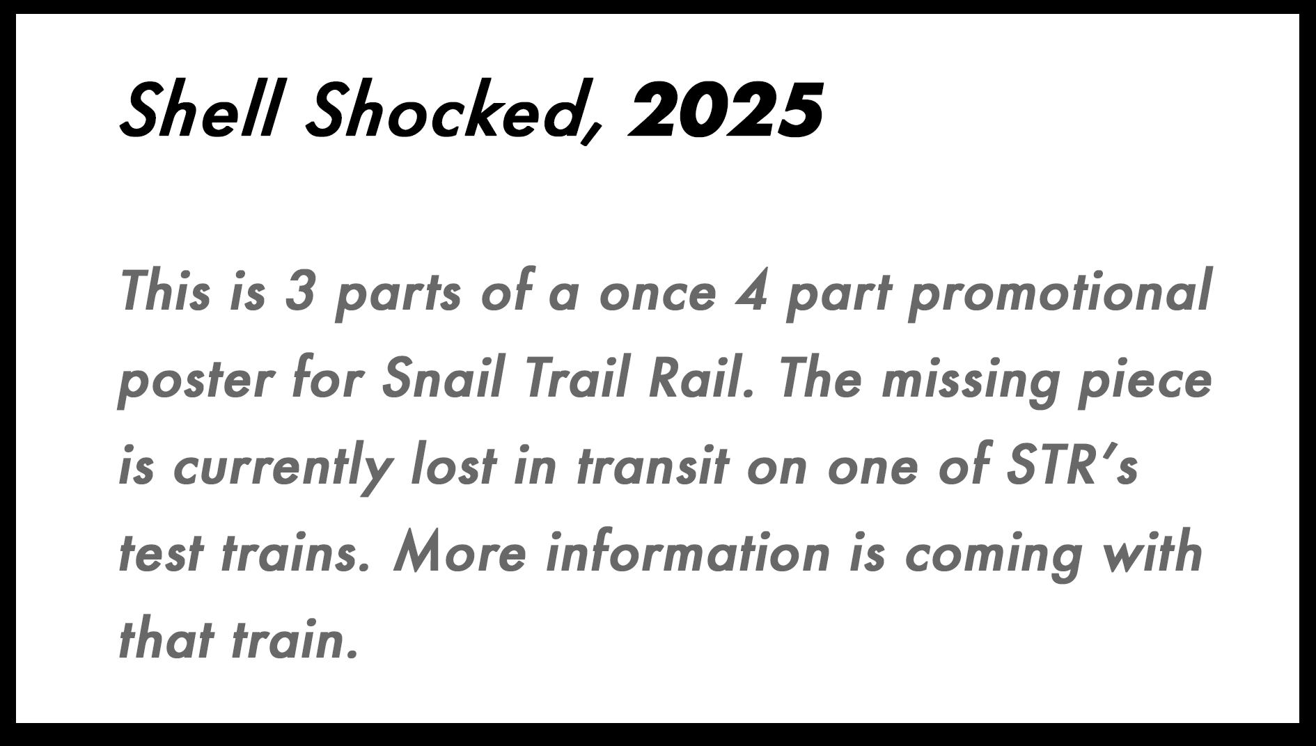 An all new museum retrospective on the pioneer of locomotion, Snail Trail Rail. Consisting of ‘Shell Shocked’ (2025), ‘Feeling Sluggish’ (2025), Powered by Shell (2025), and an exclusive complete archive of the town newsletters!
